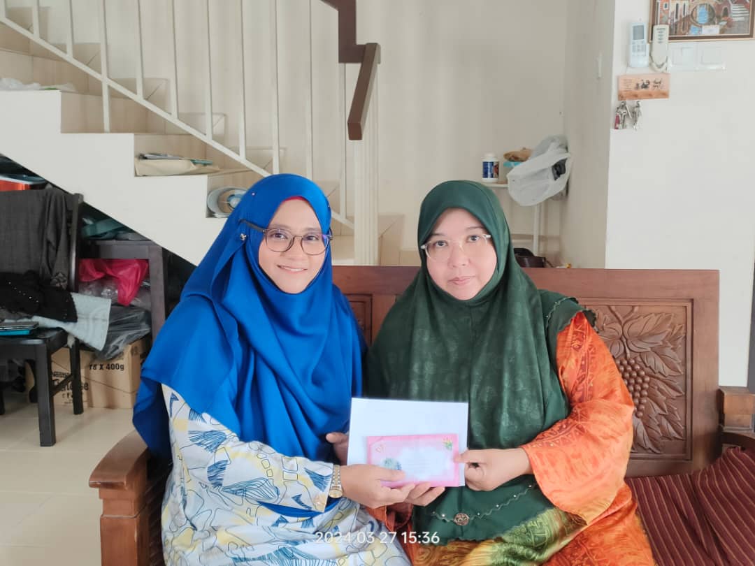 27 MAC 2024 - Pn Farah Abd Manap (kiri) selaku Bendahari menyerahkan sumbangan kepada Waris En Ridzuan yang baru meninggal dunia bulan lalu. Waris menzahirkan rasa syukur atas sumbangan khairat yang diperolehi dan mengucapkan terima kasih.
